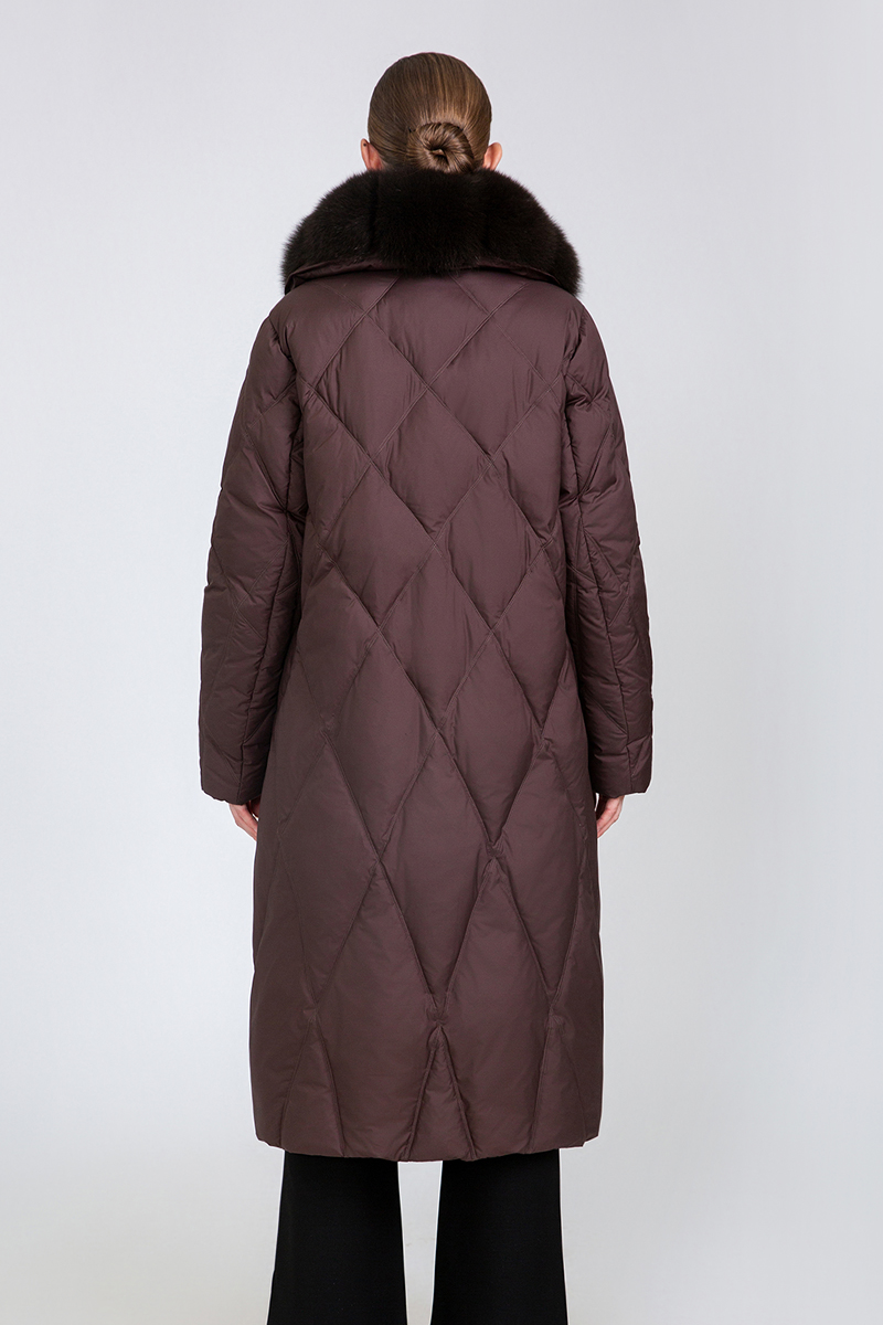 This long quilted down coat is filled with 90% premium duck down, offering lightweight and long-lasting warmth for cold winter days. It features a distinctive diamond-quilted design and a plush fur collar for a luxurious touch. Available in sizes from M to 3XL, with a down filling weight ranging from 261g to 292g, it ensures a tailored and cozy fit for all-day comfort.