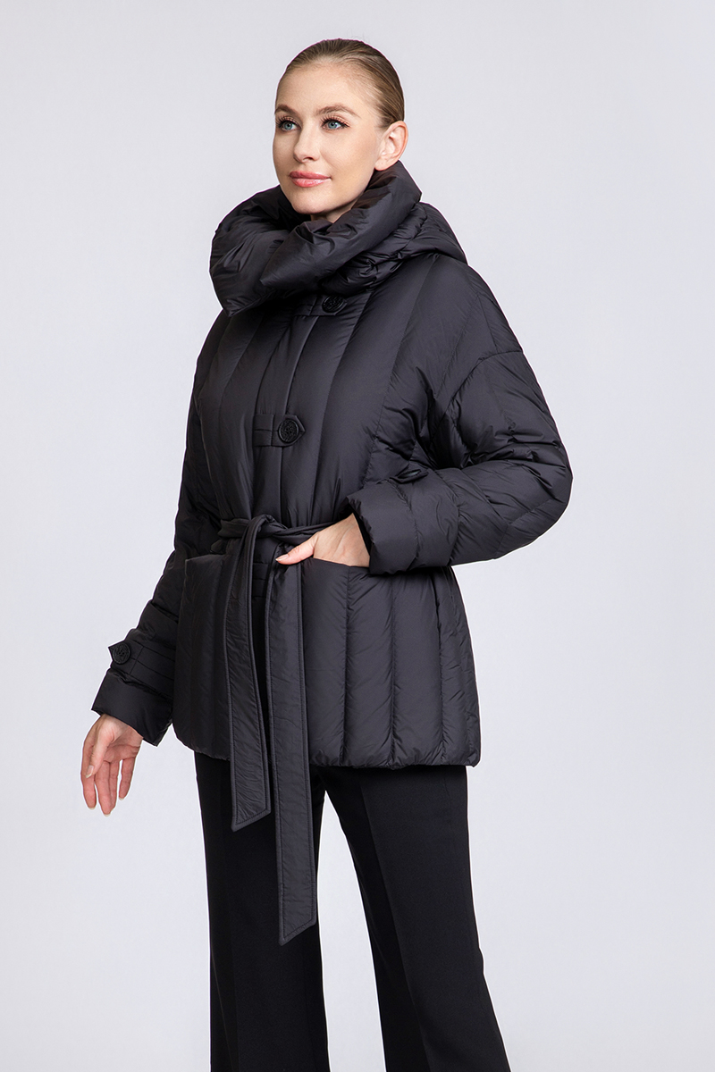 his women's short hooded down jacket is filled with 90% premium duck down (180-207g fill), offering lightweight warmth. It features a large folded hood and button details, with a removable waist belt for two versatile looks, and is available in 5 color options.