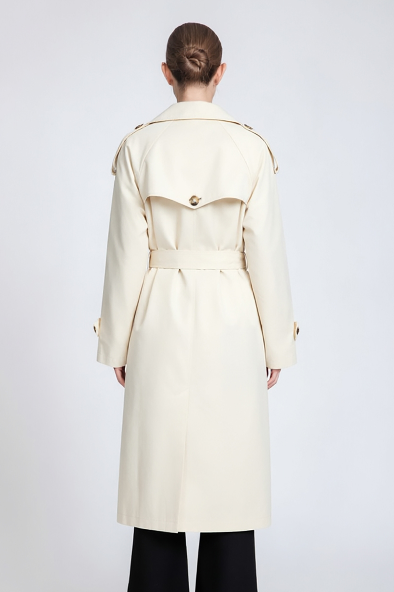 Classic Trench Silhouette: Iconic double-breasted closure with shoulder epaulettes, capturing the timeless trench aesthetic without heavy weatherproofing.